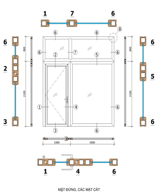 TP.001DD – CỬA ĐI MỞ XOAY MỘT CÁNH -HỆ 55 & TRÊN CỬA SỔ ĐẨY